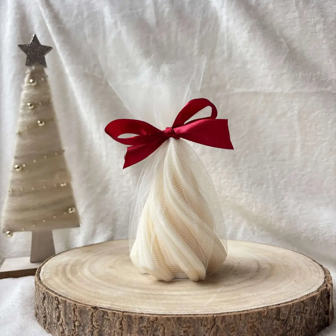 Świeca spakowana na prezent w beżowy tiul i czerwoną kokardę.
